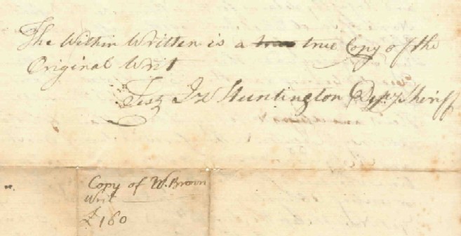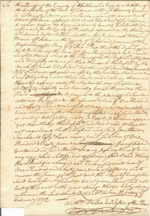 In this colonial era writ on the eve of the Revolutionary War Governor Jonathan Trumbull and Jacob Eliot, both of Lebanon, Connecticut are sued by William Brown of Salem in the Massachusetts Bay Colony for a debt of 160 pounds on a bond they signed in a handwritten writ signed by the Justice of the Peace Nathaniel Walek and on the reverse by the Deputy Sheriff, Joseph Huntington (see below).
