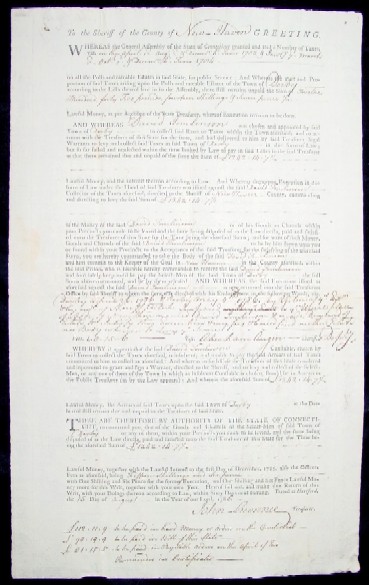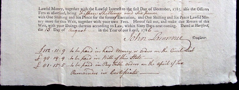This large (9 1/2 x 15 1/2") tax writ is signed by Connecticut Treasurer John Lawrence and requests the Sheriff of New Haven County to collect fifteen shillings and six pence from the Town of Derby selectmen for taxes owing from that town. The back of the writ shows that the sheriff was initially unsuccessful, but the front below Lawrence's signature seems to indicate a settlement of the matter by various payment methods. This historic document was executed before the United States Constitution and money was calculated using the English system of shillings, pounds and pence instead of dollars. The document is in very good condition and would be a nice addition for a collector of early Americana, Connecticut or financial memorabilia. Price: $95 Pay securely with credit card through PayPal by clicking the button below