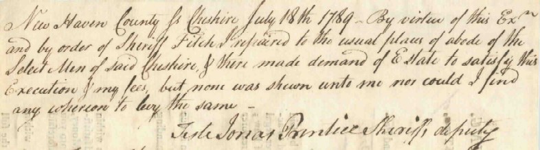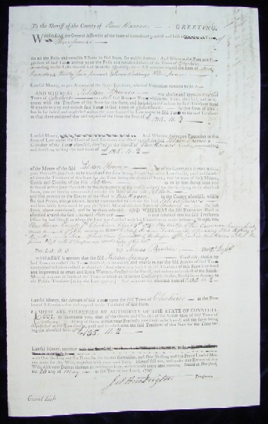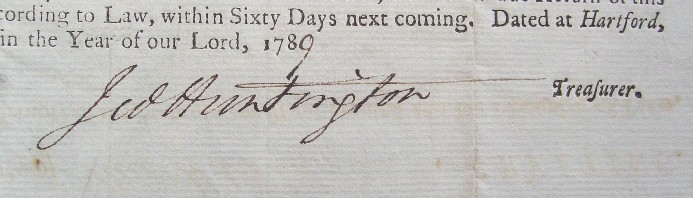 This 1789 document (about 9 x 15") was signed by Jedidiah Huntington, Revolutionary War General, who was Treasurer of the State of Connecticut at the time, but shortly thereafter in the same year was appointed by his friend George Washington to be collector of federal customs duties at the port of New London Connecticut. 1789 was the first year of the federal government and President Washington's appointment of Huntington was one of his first appointments as President. A nice summary of Huntington's illustrious military and civil career can be found at this web site. The back of the document has the sheriff's return which indicates that he could not find a selectman or anyone else in Cheshire to pay the tax.