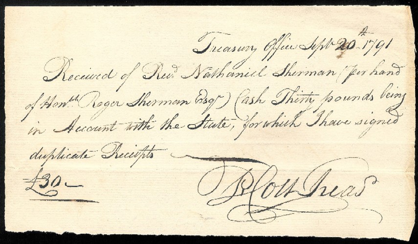 1791 Treasurer Signed Receipt for Cash Received from Roger Sherman "Received ...per hand of Hon. Roger Sherman Esq., Cash Thirty pounds"