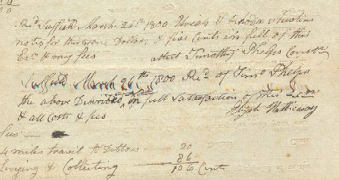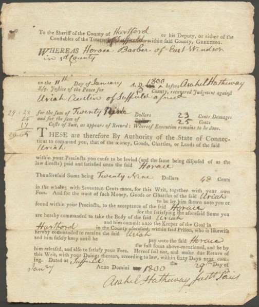 This is a quaint old legal document signed by a Justice of the Peace and Sheriff directing the Sheriff to collect a debt of Uriah Austin after a judgment of the Justice of the Peace on behalf of Horace Baber or confine the debtor Uriah to jail ("commit unto the Keeper of the Goal"). On the reverse, shown below, the Sheriff notes his success in collecting the debt and charges 20 cents for his horseback ride to the debtor and 86 cents of "Levying & Collecting."