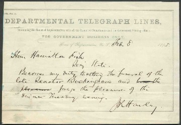 Connecticut Civil War General Joseph R. Hawley Writes To Secretary of State Hamilton Fish About Attending Funeral of Connecticut Civil War Governor William A. Buckingham
