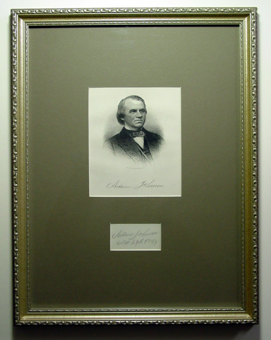 Offered here is a nice framed dated autograph of President Andrew Johnson. Johnson is most famous for being elected Vice President with Abraham Lincoln in 1864, succeeding Lincoln after the assassination and then being the first President to be impeached in 1868, but exonerated by one vote in the Senate trial. At the start of the Civil War Johnson was the United States Senator from Tennessee and became a Union hero when his state seceded but he stayed in the Senate. He was subsequently named the War Governor of Tennessee when the Union forces took control of that state. Below are close-ups of the engraving and Johnson's signature in pencil that is dated November 29, 1869.