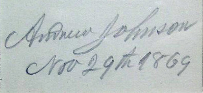 The autograph is dated in the year Johnson left the office of President of the United States and at that time he was held in very low regard as a result of his impeachment by the House of Representatives and his near miss conviction by the Senate. The charge that was almost convicted of was violating the Tenure of Office Act by firing Secretary of War Edwin Stanton without the approval of Congress. Johnson claimed the Tenure of Office Act was unconstitutional, and he was right. In many ways Johnson was vindicated by history. Both Presidents Ulysses S. Grant and James Garfield complained strenuously about the Tenure of Office Act and the Act was repealed in 1887 at the urging of then President Grover Cleveland. In 1926, in Myers vs. United States, the Supreme Court, in an opinion written by Chief Justice Taft (formerly President Taft), a similar law was held unconstitutional which required the consent of the Senate for removal of certain non-Cabinet officials. Johnson was also politically vindicated when he was elected to the Senate again in 1875. So here is the autograph of the man who was a hero of the North during the Civil War, Abraham Lincoln's handpicked Vice President and who suffered the slings and arrows of intense criticism while President for upholding the Constitution. Price: SOLD |