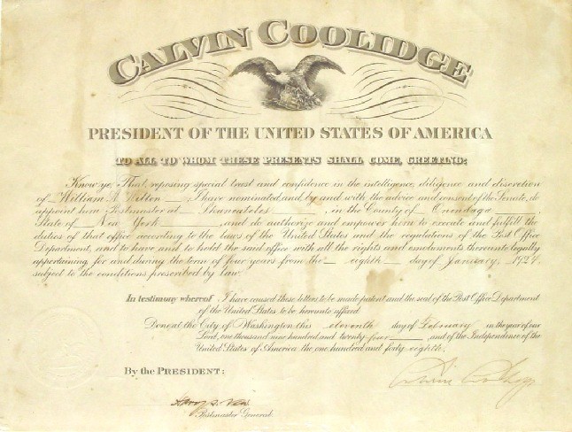 Calvin Coolidge Presidential Appointment of Postmaster of Skaneateles, New York