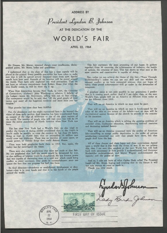This document is entitled "Address by President Lyndon B. Johnson At The Dedication of the World's Fair April 22, 1964." The body of the document is President Johnson's speech with a portrait of the President. At the bottom it has a postal stamp for the New York World's Fair and a postal cancellation dated April 22, 1964 and the signatures of Lyndon B. Johnson and Lady Bird Johnson. A close examination of the signature indicated that the President's signature is a facsimile preprinted with the document and the First Lady's signature is authentic.