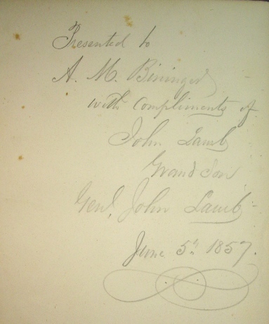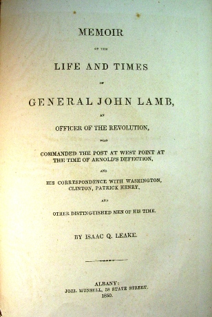 "Memoir of the Life and Times of General John Lamb, an Officer of the Revolution who Commanded the Post at West Point at the Time of Arnold's Defection, and His Correspondence with Washington, Clinton, Patrick Henry and other Distinguished Men of His Time." Rare First Edition Inscribed by Lamb's grandson in 1857 With Lithographed Maps of Battles of Yorktown, Connecticut, New York and Quebec By Isaac Q. Leake, published in Albany in 1850