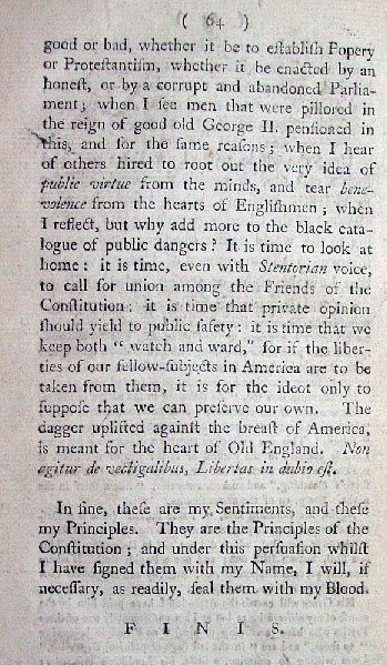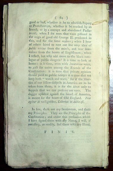 Wilkes describes Abingdon as one of the most steady and intrepid assertors of liberty in this age and he certainly was one of the strongest champions of American rights and liberties. Little can be judged of the force of his argument from the modest title of this pamphlet. In it he rallies Burke soundly for not following up with sufficient energy and persistency his first great speeches against the American War. (Stevens 1, 2.) The House of Commons debate on the habeas corpus bill which Abingdon criticizes Burke for not vigorously opposing is included in a period imprint which we are also offering, the February and March, 1777 Scots Magazine. That volume also has very interesting Revolutionary War news and commentary, including an extensive British rebuttal of the Declaration or Independence, George Washington's report to Congress on his famous victory at Princeton and Benjamin Franklin's response to the peace overture of General Howe. This bound copy has the bookplate of a former owner on the front endpaper, which reads "Volume No. 263, Library of Luther S. Kauffman." Kauffman was the Prohibition Party candidate for Congress in the At-Large district of Pennsylvania in 1920 and was an author of "Kauffman's Manual for Stock Companies" (1882) and "Romanism as a World Power" (1922), a warning to Americans of the true dangers of Roman Catholicism and her drive for world domination. Sound like he was a rich eccentric. Pictured below is the final page of Abingdon's 64 page 1777 pamphlet.