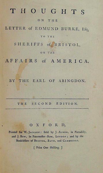 Price: $225 Pay securely with credit card through PayPal by clicking the button below First Edition of The Earl of Abingdon's Pamphlet on Affairs of America