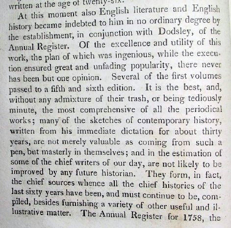 Above is text explaining Burke role in the creation, writing and editing of the Annual Register, which nowhere bears his name, and below are copies of Burke's signed receipts for payment proving his role in the important historic journals. There is label inside the front cover that says "EX LIBRIS JACOBI EMOT, BIBILOTHECAE REDWOODIANAE" with a printed date indicating is was accepted in June 1886 and a illegible signature above the label. There are stamps on the frontpiece and title page shown above the indicate the library was incorporated in 1747. There is also a library label on the spine with numbering above the title label which reads "LIFE OF BURKE." The cover shows wear on the edges and corners and there is an old repaired crack between the spine and the boards. Everything is holding together quite nicely, especially given the age and the retention of the original spine and boards. Price: $175/SOLD |