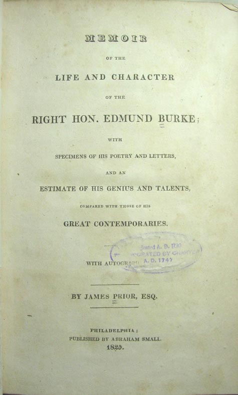 Philadelphia, Abraham Small, xx, 507 pages, by James Prior. This is an early biography of Edmund Burke by James Prior published in 1825. It was so popular that the year following a two volume set was published by Prior, much like the history of the earlier Bisset biography.