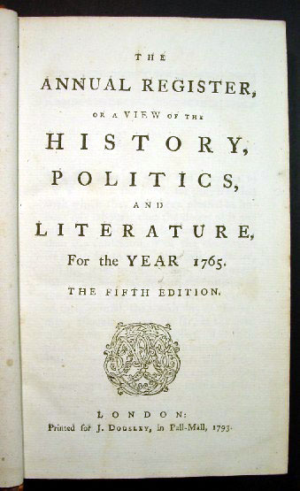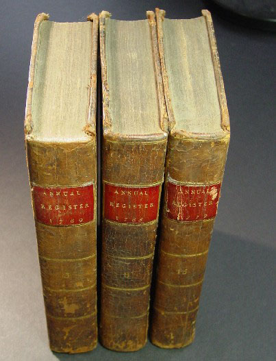 1758 through 1773 full leather set of Annual Registers This is a nice full leather set that covers the period from the start of the publication of the Annual Register in 1758 during the French and Indian War and concludes on the eve of the American Revolution. It covers the entire period when Edmund Burke was its editor and wrote most of articles and book reviews. The battle of conservative versus liberal and revolutionary are first seen in Burke's commentaries on the works of Jean-Jacques Rousseau and the conflicts over rights that would become the American Revolution are played out for the first time with regard to British imposition of stamp and tea taxes on the American colonies. It includes the 1772 volume with the early publication of the poem by the American female slave poet Phyllis Wheatley. The contents are more fully set out in the descriptions of individual volumes. Below are more pictures of the condition of this attractive set of books. The bindings and the text blocks are all tight and there is usual wear to the corners and extremities. There are no library stamps or any markings or writing that we could find. One of the title labels on the spine (for 1762) is missing but all volume numbers, from 1 to 16, are present. Price: $1,800 U. S. Shipping: $50 Pay securely with credit card through PayPal by clicking the button below |