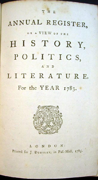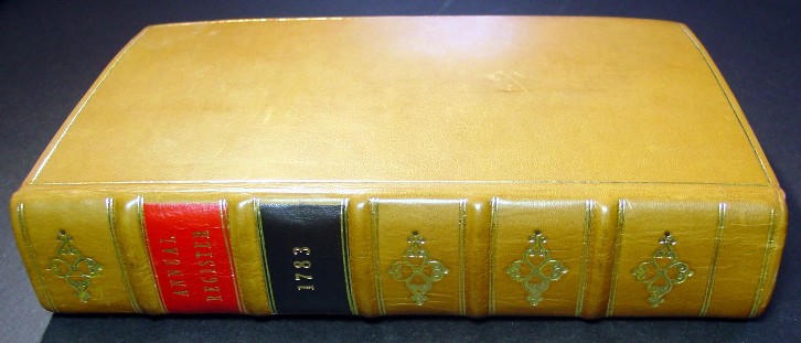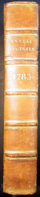 This is a first edition of the 1783 Annual Register in a fine full leather binding executed by Green Dragon Bindery. Price: SOLD