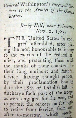 1783 Annual Register End of Revolutionary War - Peace Treaties and Recognition of American Independence George Washington Gives Up His Command of the Continental Army: Circular Address and Final Orders Emphasize Need For Stronger Federal Government The highlight of this volume is the acknowledgement by the King of England and the English Parliament that the former English colonies in America were free and independent states. In this volume that acknowledgement comes in a variety of forms, the full text of the speech of King George III in December 1782 in which he notes his offer "to declare them free and independent states," the full text of the September 1783 peace treaty between the United States and England signed by Benjamin Franklin and John Adams, and an extended history of the peace negotiations and significance of the treaty provisions. There are two more interesting historical items in this volume that flowed directly from those peace negotiations. The first was settling account with France, the biggest financial and military supporter of America during the war and the second was the resignation of George Washington as head of the Continental Army and his advice to his troops, Congress and Governors. Below are two excerpts from the speech of King George III to Parliament in December 1782 which for the first time acknowledged American independence and his self-serving wish that "America may be free from those calamities which have formerly proved in the mother country how essential monarchy is to the enjoyment of constitutional liberty." He was right that something more than the Articles of Confederation were needed, but it was not an monarchy, it was our own Constitution adopted in 1787.