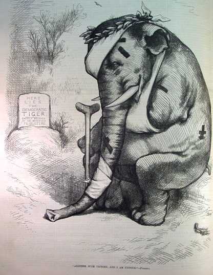 The Republican's won the election but they were severely battered, a point which Thomas Nast emphasized in his cartoon below showing his classic elephant symbol for Republicans heavily bandaged with the caption "Another such victory and I am done."