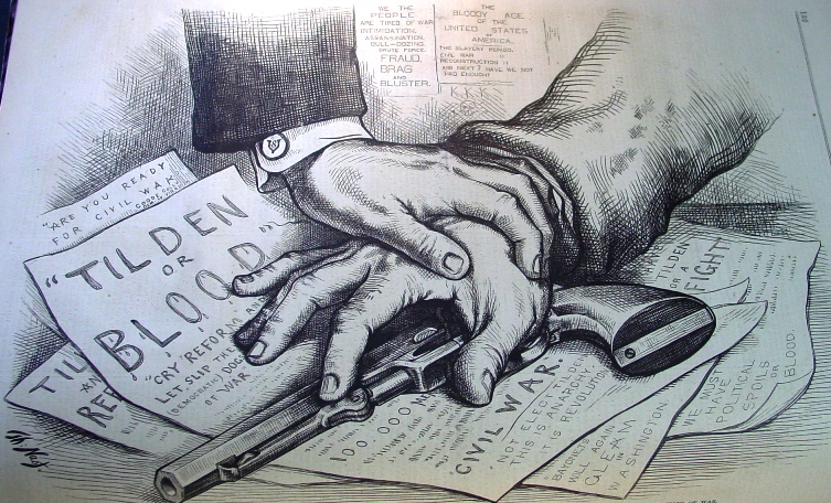 Samuel Tilden was the Democratic candidate of the Southern States and urban north and he clearly was cheated out of an electoral victory. The South saw Tilden's election as the end of Reconstruction and Northern and federal interference in their states, so it was a very emotional and bitter fight. Ultimately, the compromise which gave the election to the Republican candidate Hayes gave the South what it wanted most, the withdrawal of federal troops from the South. Thomas Nast's cartoon below in the midst of the controversy shows how serious the matter was with threatened violence.