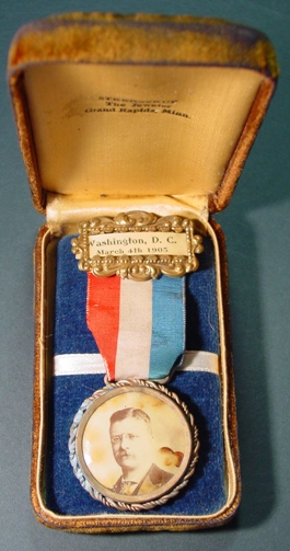 1905 Theodore Roosevelt Presidential Inauguration Portrait Ribbon Badge Enclosed in Vintage Box