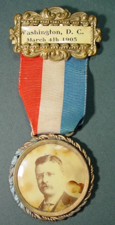 This wonderful vintage inauguration souvenir is a portrait ribbon badge from the March 4, 1905 Inauguration of Theodore Roosevelt as President of the United States. It gives the date and place of the inauguration, which was relevant in Roosevelt's case because his first inauguration was a hurried swearing in after the assassination of President William McKinley in Buffalo, New York in 1901.