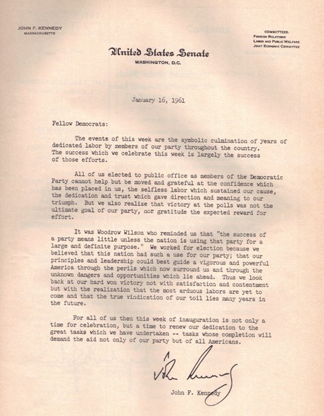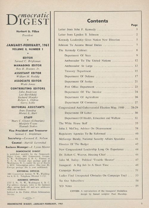 This interesting publication of the national Democratic Party issued to coincide with the Inauguration celebration on January 20, 1961 provides lots of information on John F. Kennedy and his new cabinet. The most interesting article in light of the 2009 inauguration of Barack Obama is the description of Dr. Robert C. Weaver, the new head of the Housing Finance Agency (later incorporated into the new Department of Housing and Urban Development) as "the highest Federal position ever held by a Negro."