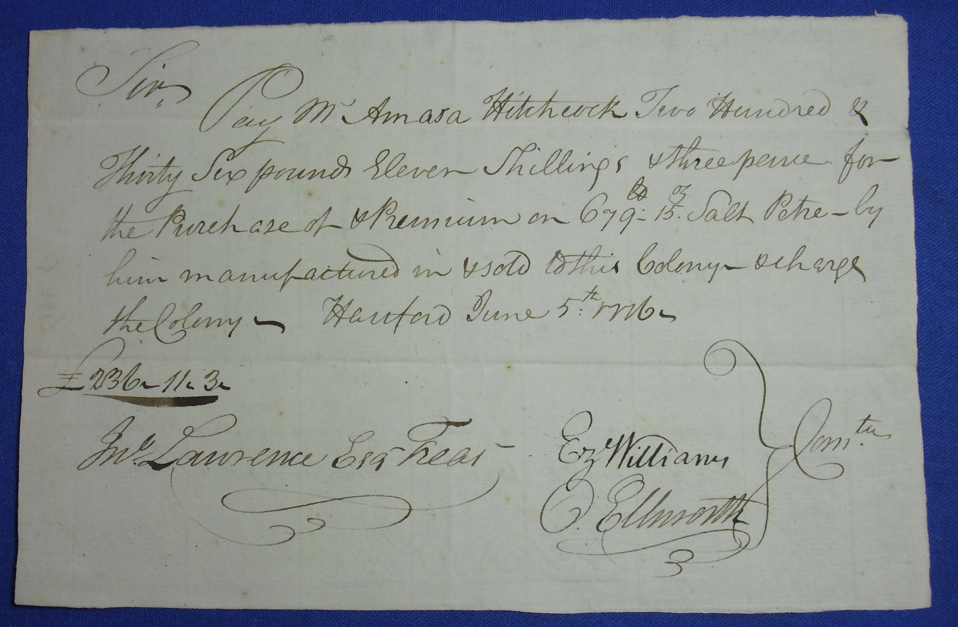 Chief Justice Oliver Ellsworth 1776 Revolutionary War Document Signed Document Paid Amasa Hitchcock for Saltpeter for Making Gun Powder Document Signed Month Before Declaration of Independence, Still Refers to State as "Colony"