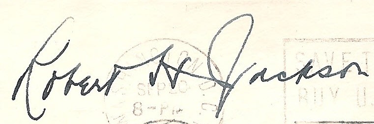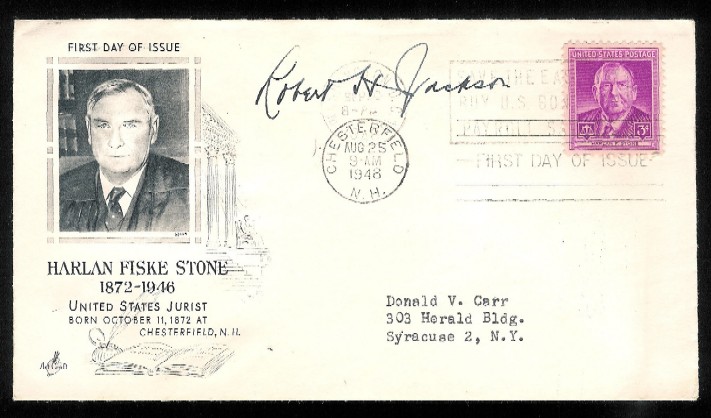 Supreme Court Justice Robert H. Jackson signed this 1948 first day postal cover honoring the Supreme Court Justice that Jackson replaced on the court, Justice Harlan Fiske Stone. Justice Jackson was appointed to the court by President Franklin D. Roosevelt after serving Roosevelt in various legal roles starting in 1934 and concluding with the post of Solicitor General. Justice Jackson is widely credited with being one of the best Supreme Court justices and is widely quoted today, even in Supreme Court confirmation hearings (Justices Roberts and Alito being the most recent). My personal favorite is the statement from his dissent in Terminiello v. City of Chicago, 337 U.S. 1 (1949) that, "There is danger that, if the court does not temper its doctrinaire logic with a little practical wisdom, it will convert the constitutional Bill of Rights into a suicide pact."