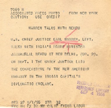 Genuine Associated Press wire photograph of Chief Justice Earl Warren and India's Prime Minister Jawaharal Nehru taken on August 29, 1956. The back of the photo has attached to it the identification shown below. This comes from the San Francisco Examiner archives. It looks like Nehru is wearing one of those trendy Nehru jackets.