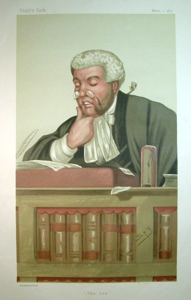 This original Vanity Fair print by Spy (Sir Leslie Ward) from 1879 is entitled "The Law" and pictures the first Jewish judge, Sir George Jessel, on the bench studying his legal papers. This print with full borders comes already matted with acid free mat board to a standard frame size (16 x 20") and the description of the Judge Jessel by Jehu Junior that was provided when the print was originally published in 1879. Below are description and how the print looks matted.