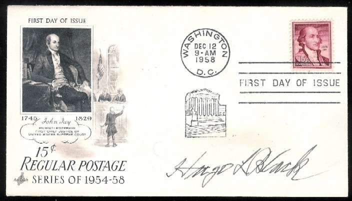 Justice Hugo L. Black 1958 Signed Postal Cover Honoring First Chief Justice John Jay