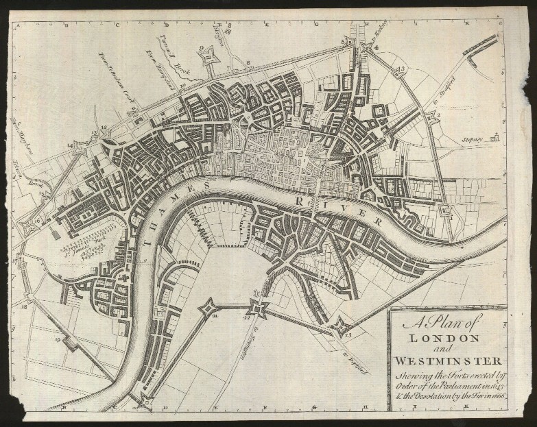 "A Plan of London and Westminster Shewing the Forts Erected by Order of the Parliament in 1643 & the Desolation by the Fire in 1666."