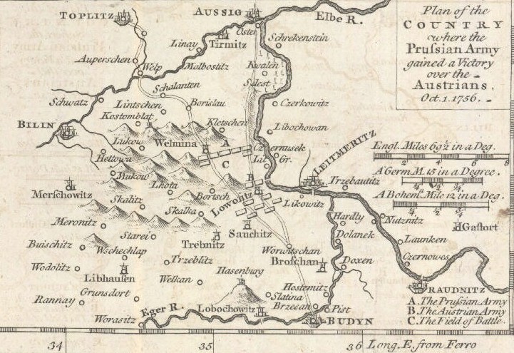 Below is the inset, "Plan of the country where the Prussian army gained a victory over the Austrians, Oct. 1, 1756."
