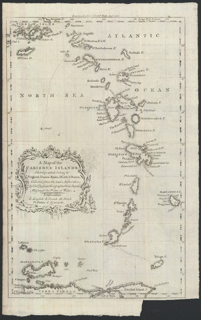 "A Map of the Caribbee Islands; Shewing which Belong to England, France, Spain, Dutch & Danes, Collected from the Best Authorities; by Thos. Jefferys, Geographer to His Royal Highness the Prince of Wales"