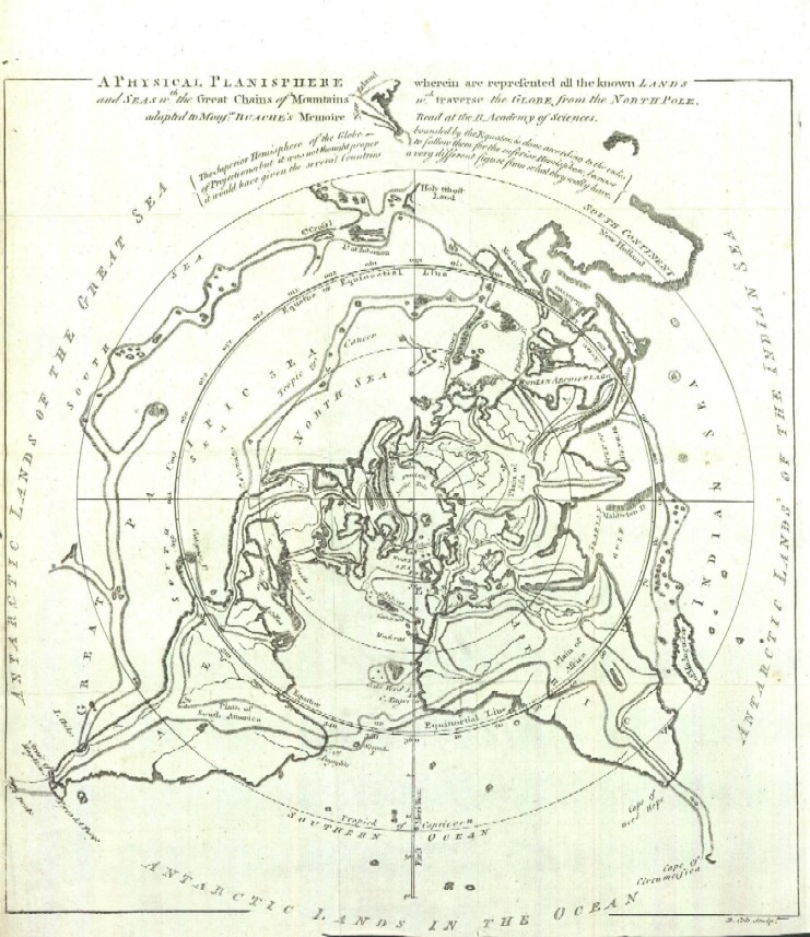 "A Physical Planisphere wherein are Represented All the Known Lands and Seas wth. the Great Chains of Mountains wch. Traverse the Globe from the North Pole. Adapted to Monsr: Buache's Memoire Read at the R. Academy of Sciences"