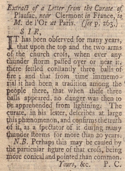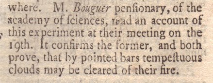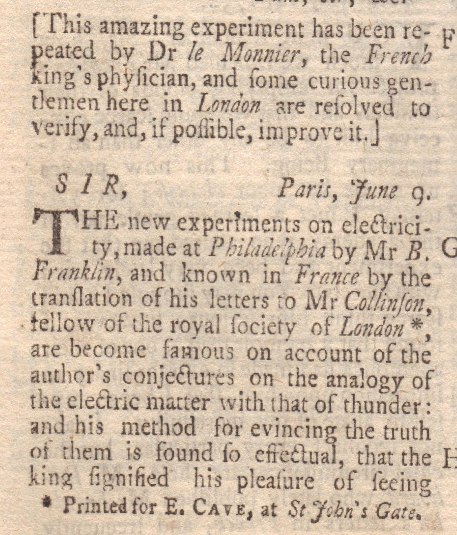 French King Witnesses Electricity Experiment Conducted by His Physician Based on Ben Franklin's Work "by pointed bars tempestuous clouds may be cleared of their fire.” French Scientist Unbeliever Now Convinced by Franklin's Hypothesis; British Royal Society Convinced by Franklin's Proof Collinson Notes Lighting Hitting French Church Cross Consistent with Franklin Hypothesis The highlight of this June 1752 issue of Gentleman's Magazine are three letters/articles on Ben Franklin’s lightning rod hypothesis and it confirmation by French experiments; 1) Peter Collinson, Ben Franklin's regular correspondent and Fellow of the Royal Society comments upon cross on top of French cathedral, hit by lightning and the natives observations about safety from lighting 2) a Letter from a Gentleman in Paris conceding he was wrong about Franklin’s conclusions and 3) a report of electrical experiment performed by the King’s physician for French King which states that,
