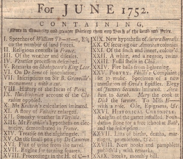 The article also notes that accounts of these French experiments were read to the British Royal Society and that they “both prove, that by pointed bars tempestuous clouds may be cleared of their fire.” The interest of the French King in Franklin's work and the French experiments cemented Ben Franklin's international reputation and make him the perfect choice by the Continental Congress many years later to be the American envoy to seek French assistance during the Revolutionary War. (See excerpts below) Other articles in this issue include, “Argument for inoculation for Small Pox Fallacious”; the History of the Incas of Peru; extract of a Treatise on the Nightingale with engraving of a Nightingale and traps and cages for capturing and keeping Nightingales ; a letter from Virginia on a negro wench who had negro and mulatto children; an article on the Aurora Borealis; and an article on securing American colonies from French incursions. Below are pictures of portions of the electricity articles, the index to the issue and a Nightingale.