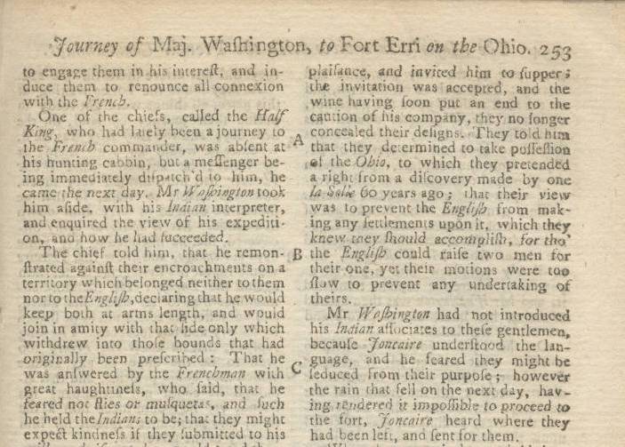 Below is the table of contents from this issue, with the George Washington expedition described as "Journey from Williamsburgh to the French fort on the Ohio."