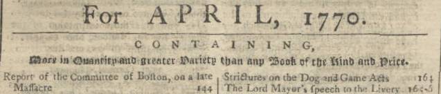 The British newspaper/magazine "Gentleman's Magazine" gave top billing to the "Report of the Committee of Boston, on a late Massacre" as shown by a portion of the front page index pictured above. The following page was the full page report of the committee which was signed by John Hancock, Dr. Joseph Warren (as General Warren he was killed at the Battle of Bunker hill, famously portrayed by Jonathan Trumbull in his painting of the battle). Below is the start and end of the report with the top portion of the signatures of the committee members.