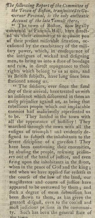 Early Report of Boston Massacre, March 5, 1770 Full Text of Committee of Boston Report Signed in Type by John Hancock and Sam Adams "a party of seven or eight soldiers, were detached from the main-guard, under the command of captain Preston, and by his orders fired upon the inhabitants, promiscuously, in King-street, without the least warning of their intention.." Also Includes Account of Incident by British Captain Preston "A general attack was then made on the men by heavy clubs, and by snow balls, by which all our lives were in imminent danger; some persons behind called out 'Damn your bloods, why don't you fire?' Instantly three or four of the soldiers fired, one after the other, and then directly after three more, in the same confusion and hurry."