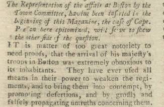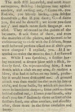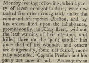 Captain's Preston's Account of the Boston Massacre was, of course, quite different than the Boston Committee. John Adams later successfully defended Captain Preston, whose account of the incident proved more accurate than the Boston Committee's report. The courtroom scene in the HBO series "John Adams" was good theatre and very close to being historically accurate. Below are portions of Captain Preston's account.