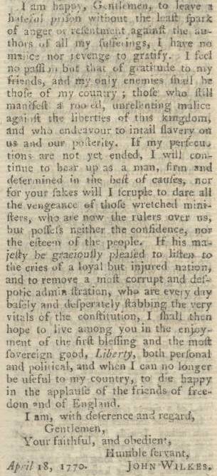Also in this issue, British champion of liberty John Wilkes writes a letter from prison where he was confined from speaking against King and Parliament. His election as a Member of Parliament had been nullified because he was in jail. Wilkes eventually got his revenge, being later elected the Lord Mayor of London and Member of Parliament. He was an ardent and commendable advocate of Freedom of Speech and Freedom of the Press and opposed British policies regarding the American colonies.