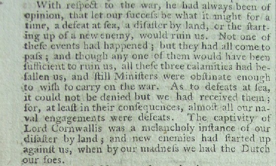 The excerpt from the debate below contains the contributions of four members of Parliament, two on each side of the question. It includes a member supporting the resolution who succinctly rebuts the argument that the war in America is against France by stating that if true it means 3,400 French soldiers were defeating 73,000 British troops, a conclusion which any loyal British citizen must refuse to accept.