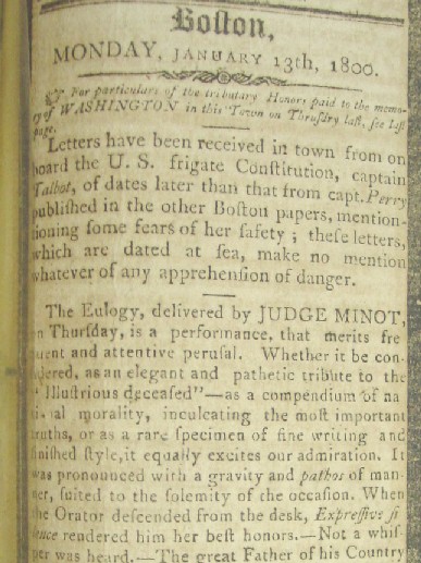 Death of George Washington and Boston Testimonials Black Bordered January 1800 Russell's Gazette Full of Honors for George Washington This complete and original January 13, 1800 Russell's Gazette is full of tributes to George Washington after his death and contains an extensive series of reports on the official Boston ceremonies highlighted by one of the more famous eulogies to Washington by Judge George Minot. Above on the right is the left is a picture of the black bordered front page and to the right is the report on the Berwick, Massachusetts ceremonies in which the eulogy to Washington was given by Benjamin Greene. Below are some of the reports on the extensive Boston ceremonies, beginning with the report of the procession and then a report on the Eulogy delivered by Judge Minot.
