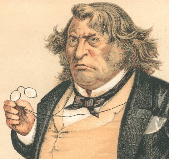 This is an original 1872 Vanity Fair print of the United States Senator from Massachusetts, Charles Sumner, the leading Abolitionist in Congress, who was beaten severely by a Southern while he was in his Senate seat in 1856 and returned four years later to be a major supporter and antagonist to Abraham Lincoln. The print is titled "STATESMEN, No. 113" and under that "The Massive Grievance" which refers to the dispute with England over reparations for the English allowing the Southern warship Alabama to be built on their shores. Included with the print is the description of Sumner by Jehu Junior for Vanity Fair, and an unusually complimentary one it is. Below is a close-up of the Sumner print and an excerpt from the Vanity Fair biography of Sumner.