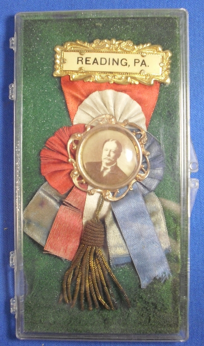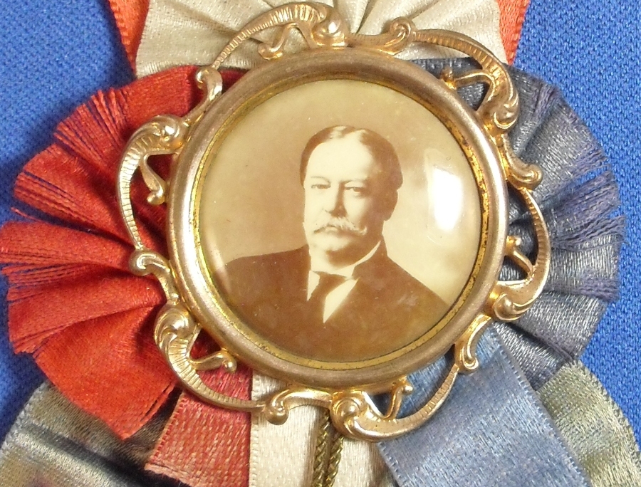 This is a beautiful political event ribbon badge for William Howard Taft running for President of the United States in either 1908 or 1912 as the Republican candidate. He won in 1908 but when Theodore Roosevelt split the Republican vote by running as a Progressive in 1912 it resulted in the election of Woodrow Wilson as President. Taft later got the job he wanted when he was appointed to the Supreme Court by President Warren G. Harding in 1921. Below are a close-up of the Taft celluloid image and a picture of the ribbon badge in the protective plastic holder that will come to the buyer. Price: $125/SOLD
