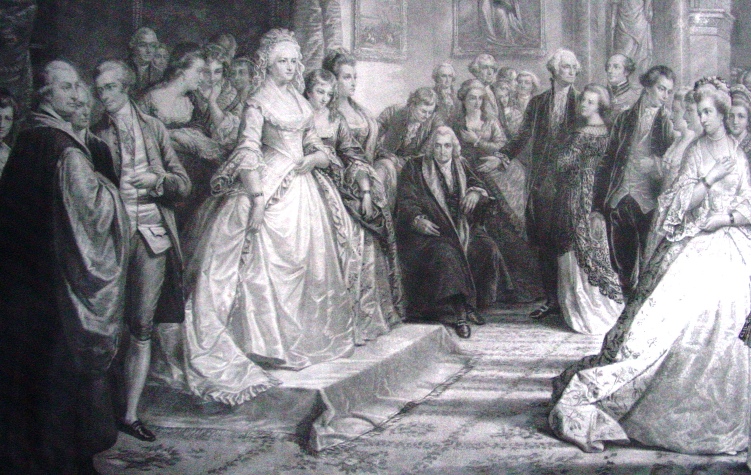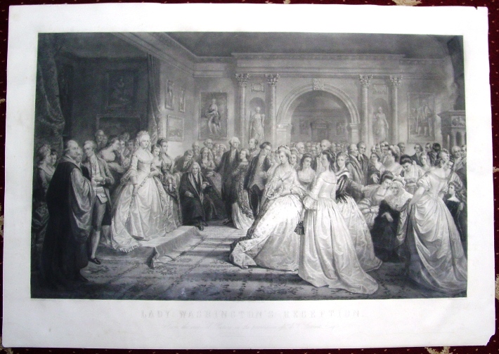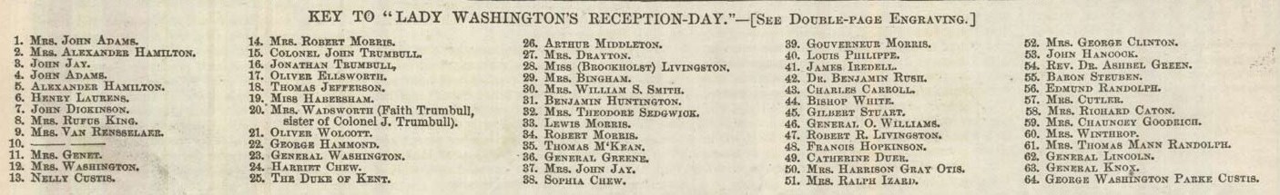 Shown in this print are all the prominent people of the founding generation of American in one location and accurately pictured. The picture is a composite of the reception Mrs. Washington's held and is designed to convey the grandeur of her court and the respect with which the President and Mrs. Washington were held after the Civil War. Mrs. Washington is shown prominently on the left side on a riser, with Alexander Hamilton, John Adams and John Jay to the left. The 64 people present and identified in the print are named below and they prominently include, in addition to the above named, George Washington, Thomas Jefferson, Robert Morris, General Greene, John Hancock, Edmund Randolph, Oliver Ellsworth, General Lincoln and General Knox: