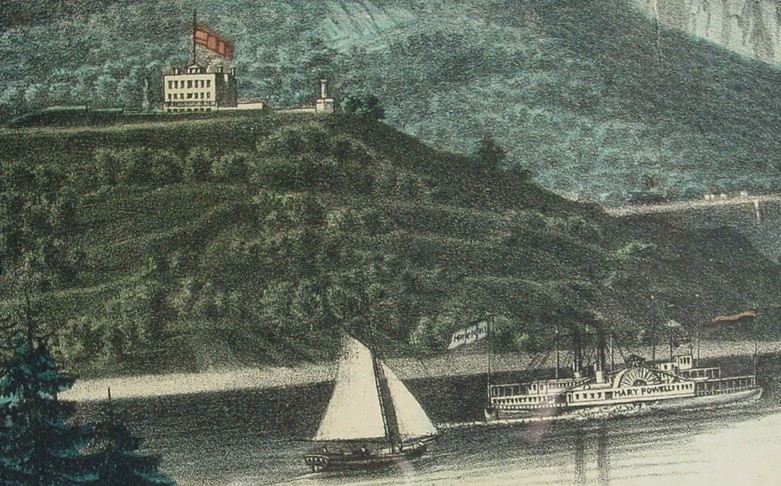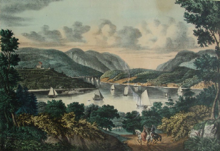 “VIEW ON THE HUDSON AT WEST POINT" 1860s Lithograph Shows Steamship Mary Powell & U. S. Military Academy