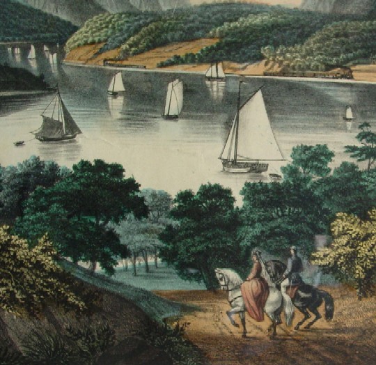 The detailed view below is of the right bottom corner of the lithograph and it shows two people on horseback, lots of sailing vessels on the Hudson and two railroads on the edge of the river.