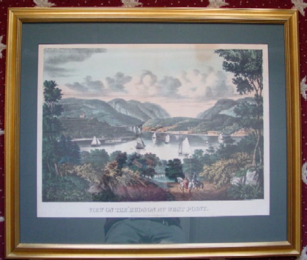 This is a rare 1860s lithograph by F. Blumner of the Hudson River, the United States Military Academy and the "Queen of the Hudson," the steamship Mary Powell. The Mary Powell and the West Point Military Academy are shown in greater detail below. The print published by Lyon & Co 147 Spring St. N.Y. will come to you matted and framed as shown below. The print inside the matt measures 25.5 x 19 inches and the framed size is 32.5 x 27.5 inches. This large view is in the style of Currier & Ives and shows a plethora of river traffic and railroads. The detailed view below shows the West Point Military Academy on the bluff above the river and the Mary Powell steamship identified by on side and on its flag. The Mary Powell first went into service on the Hudson River in 1861 and the print is probably from that period to as late as the 1870s. A very similar view, apparently copied from this one, was done by H. Schile in 1874.