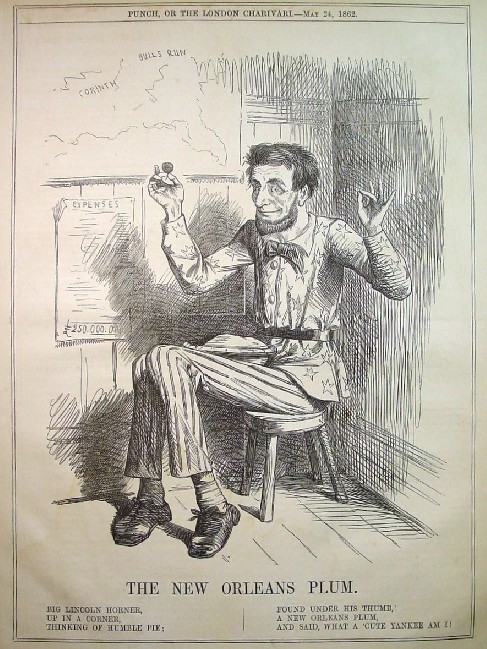 From Lincoln in Caricature by Rufus Rockwell Wilson The cartoon, The New Orleans Plum, which appeared in London Punch on May 25, 1861, was suggested by the capture the preceding month of New Orleans by Union naval and land forces under Farragut. The artist borrowing from an old nursery tale, shows Lincoln seated in a corner and plucking a plum from the generous pudding in his lap. Possibly for fear that his caricature might not be perfectly clear to the British mind he appended to it these informing words: “Big Lincoln, up in a corner, thinking of humble pie, found under his thumb a New Orleans plum and said ‘What a cute Yankee am I.’ The capture of New Orleans, a city of 168,000 and the largest seaport of the South, was the first great naval victory of the war, and made Farragut, a native of the South who had remained loyal to the Union cause, a master and directing spirit in all major operations at sea during the remainder of the conflict. Mr. Lincoln at once advanced him to the rank of rear admiral, and thereafter gave him his confidence in full and unstinted measure. And the President made no mistake in honoring and trusting Farragut, for the latter’s capture of New Orleans was an event of present and future import in a troubled period. A little more than a year later after a long and stubborn siege a Union army under Grant and Sherman, aided by Farragut and his fleet, compelled the surrender of Vicksburg, sundering the Confederacy in twain, and in another month a President, confident of the future, could write old friends in Springfield: “The Father of Waters again goes unvexed to the sea.”