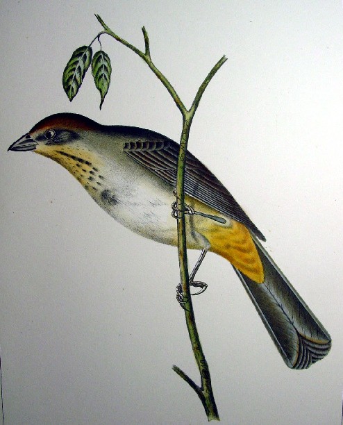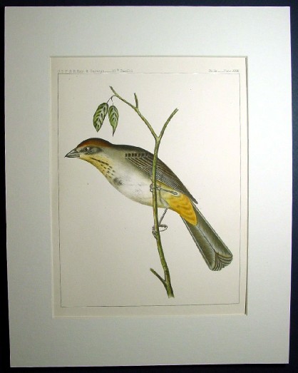 1850s Hand Colored Stone Lithographs of Birds of the West Brown Towhee This pretty little colorful bird was identified on the 35th parallel survey at Bill Williams' Ford in New Mexico on February 5, 1854 and was first described from the specimen captured there. The upper margin says "U.S.P.R.R. Exp. & Surveys --- 35th Parallel" and "Birds. --- Plate XXIX." Below is the lithograph of the Brown Towhee as it will come to you matted and in a protective clear plastic sleeve. Price: SOLD