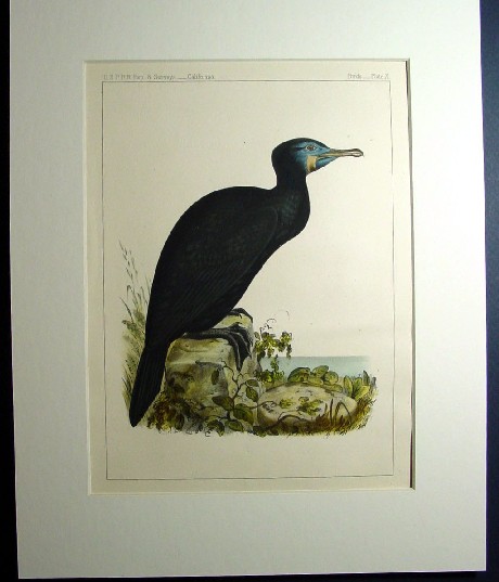 1850s Hand Colored Stone Lithographs of Birds of the West Brandt's Cormorant This big shore bird identified in the California expedition and survey published in 1859 has a wingspan of 50 inches is called Brandt's Cormorant. On the top margin of the print is says "U.S.P.R.R. Exp. & Surveys---California" and "Birds --- Plate X." Below is the lithograph as it will come to you matted and in a protective clear plastic sleeve. Price: $50 Pay securely with credit card through PayPal by clicking the button below
